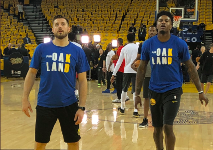 根據(jù)The Athletic記者Sam Amick報道,勇士在本場比賽前,特別訂做了印有“為了奧克蘭”字樣的球員熱身T-恤衫和毛巾(見新聞配圖),并為了支持此前受傷的球隊前鋒凱文-杜蘭特,特意將KD兩個字母印在最后,可以看作是“為了奧克蘭,為了KD”。